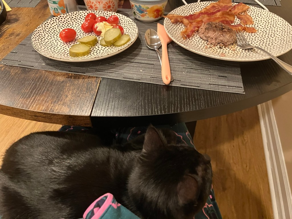 She doesn’t try to eat my food. Usually. She is occasionally interested in knocking my silverware off the table. But in general she doesn’t need anything. Not pets or scritches or even my attention. She just wants to be there.